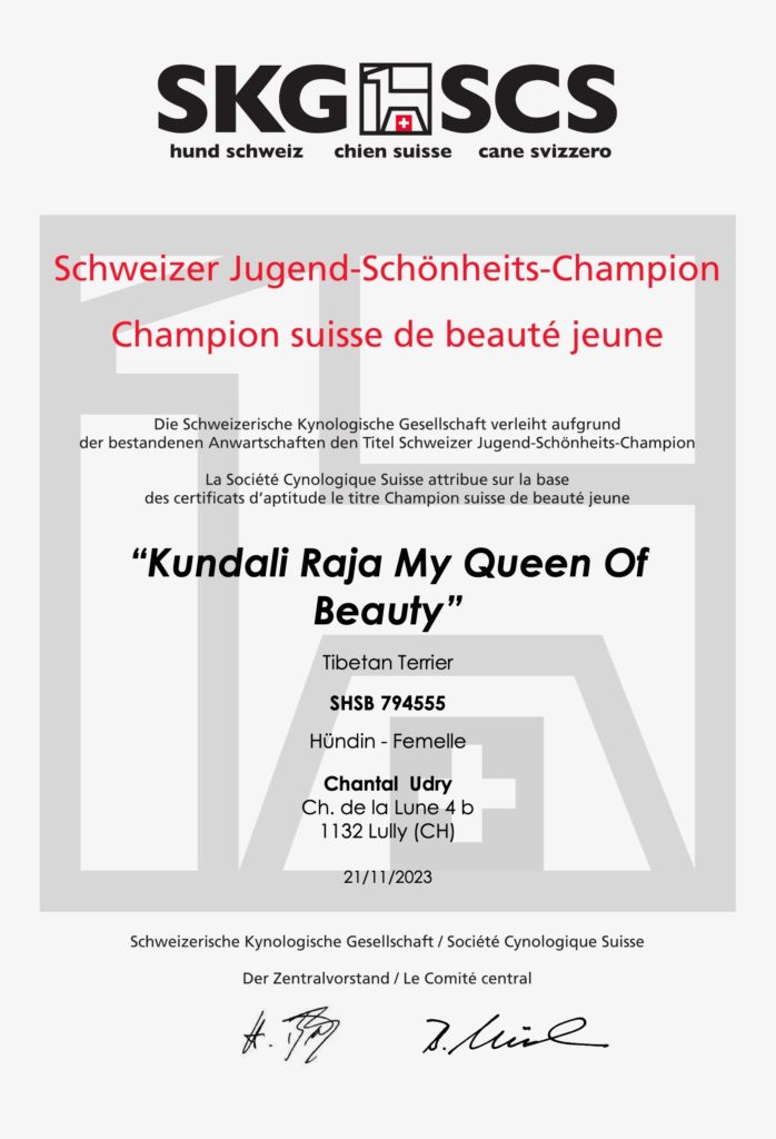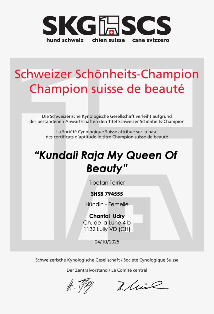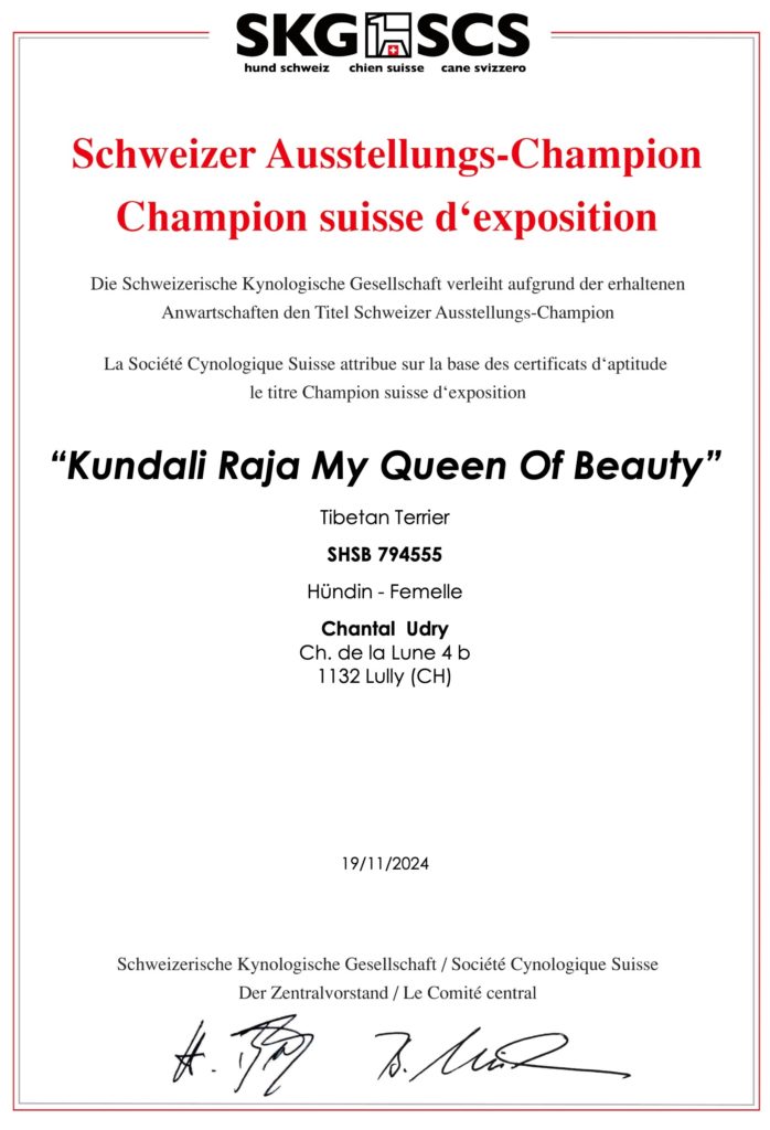 Ses propriétaires ont l’aimable gentillesse de lui donner la possibilité de devenir une chienne d’élevage KUNDALI. Madame Udry présente très professionnellement sa chienne en exposition canine.